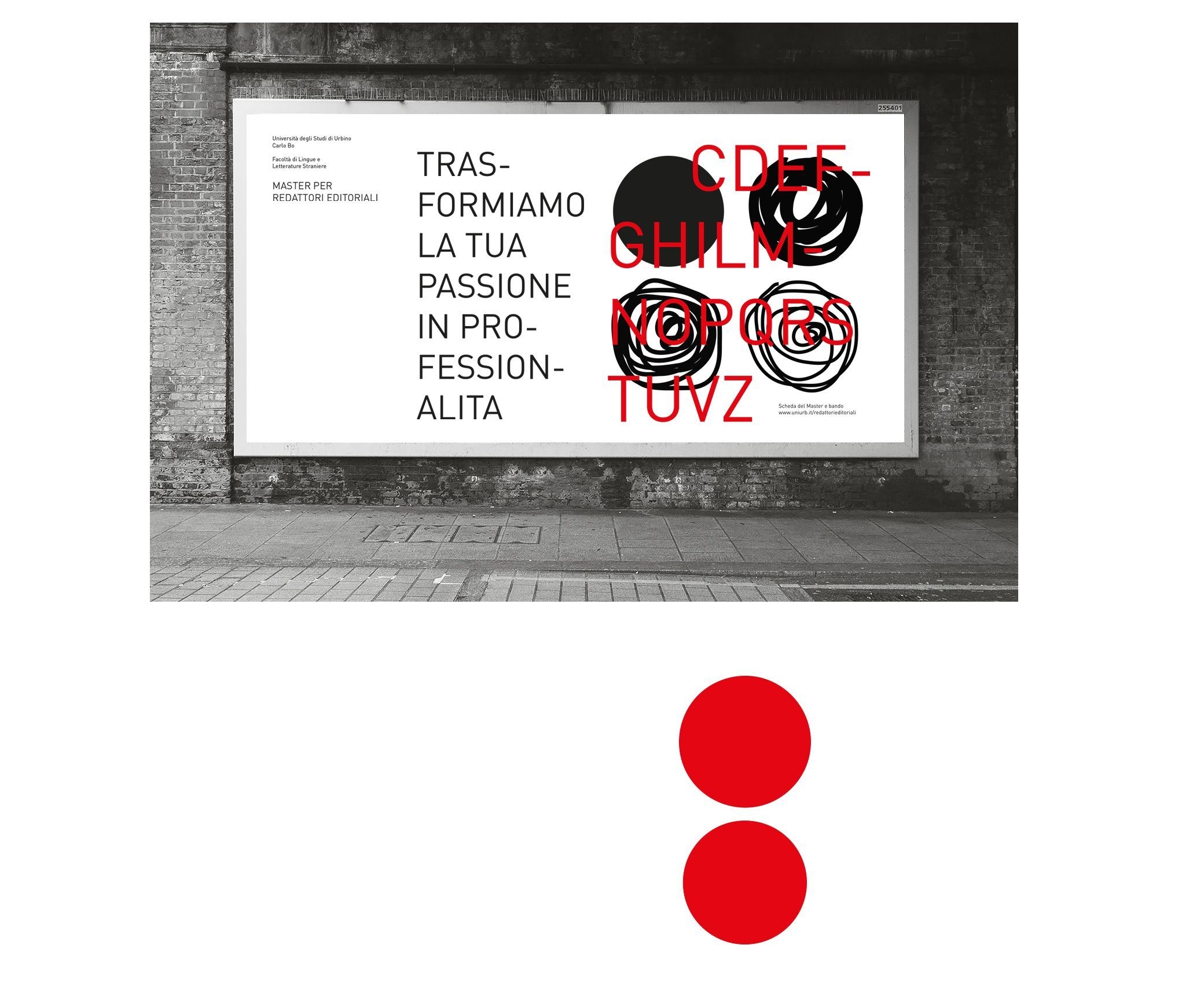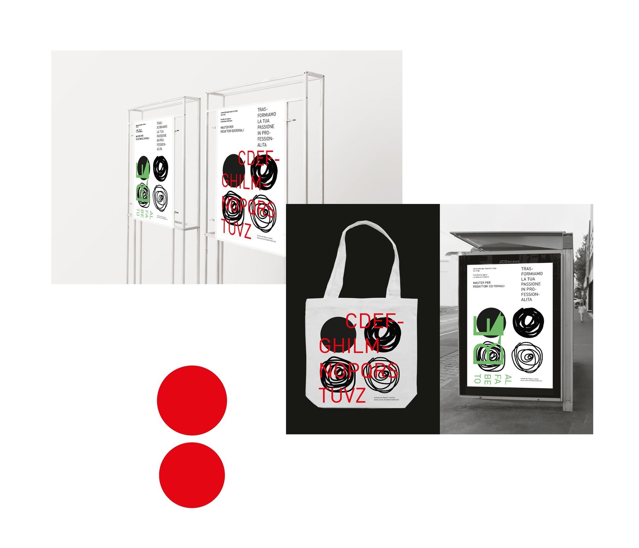 The visual identity for the Master in Editorial Writing (MRE) at the University of Urbino was conceived to embody the contemporary editor a professional capable of navigating the precise structures of editorial work while embracing the fluid energy of literary creativity. This identity seeks to capture the transformative journey from passion to professionalism, giving form to the invisible processes behind writing, editing, and content creation. At the heart of the concept lies the interplay between chaos and order. The organic, gestural forms scribbles and circles represent the raw material of publishing: the nascent idea, the unfinished manuscript, the tireless research, and the passion that drives one toward the editorial profession. These elements are balanced by a rigorous typographic grid, where letters and text blocks in black and red act as organizing forces. They symbolize the editor’s hand shaping the chaos into clarity, readability, and ultimately, market-ready content.